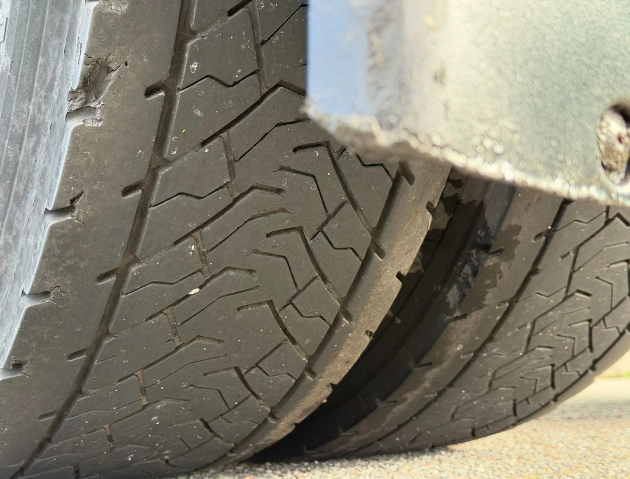 Hinterachse: Doppelbereift; Max. Achslast: 11500 kg; Marke Achsen: Goodyear R; Reifen Profil links innnerhalb: 20%; Reifen Profil links außen: 20%; Reifen Profil rechts innerhalb: 20%; Reifen Profil rechts außen: 20%; Reduzierung: einfach reduziert