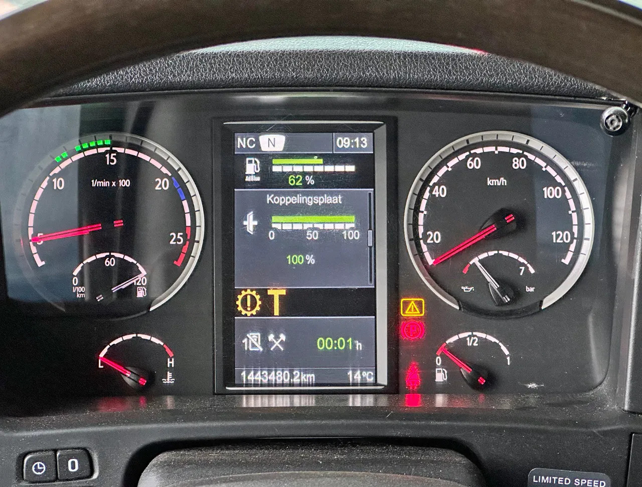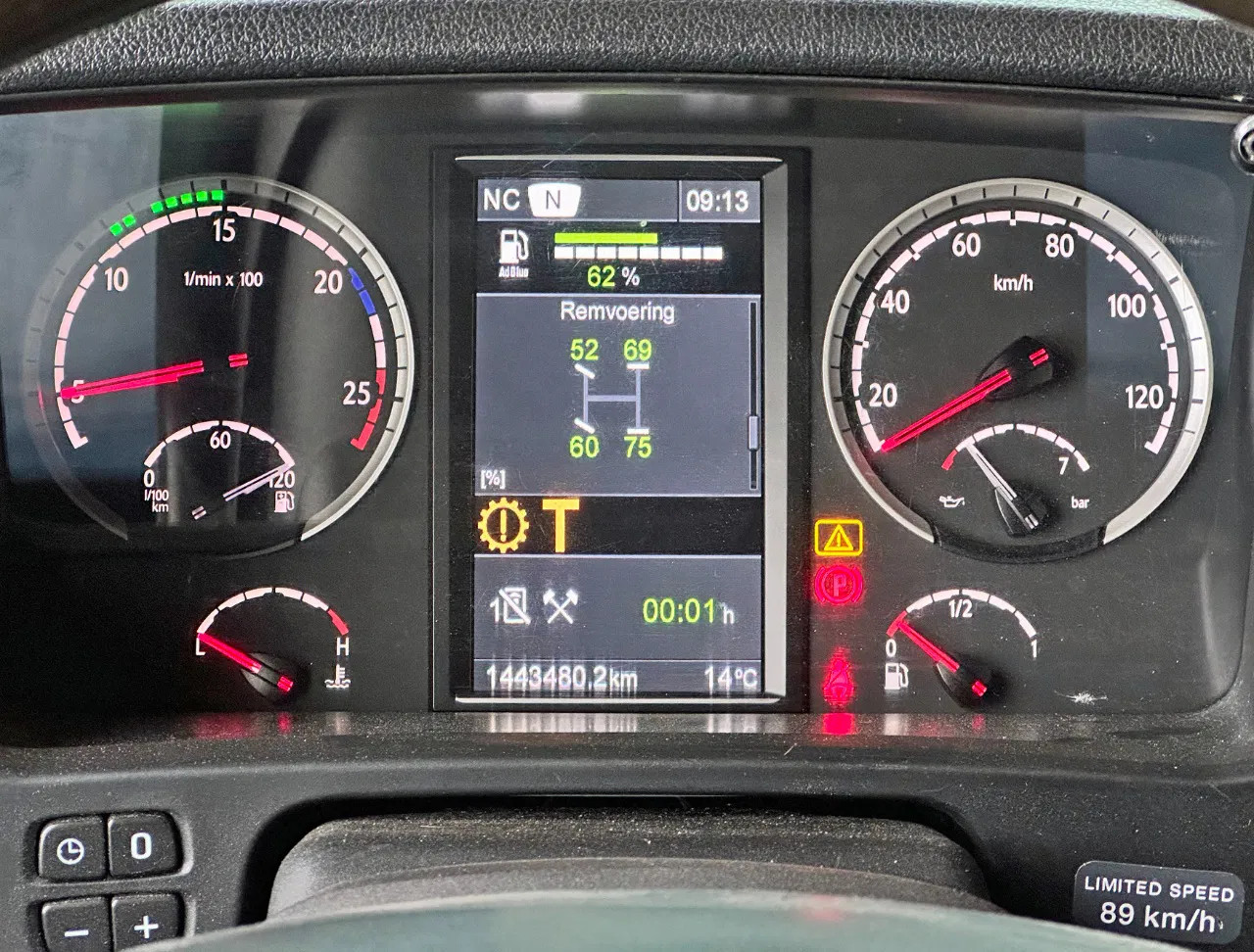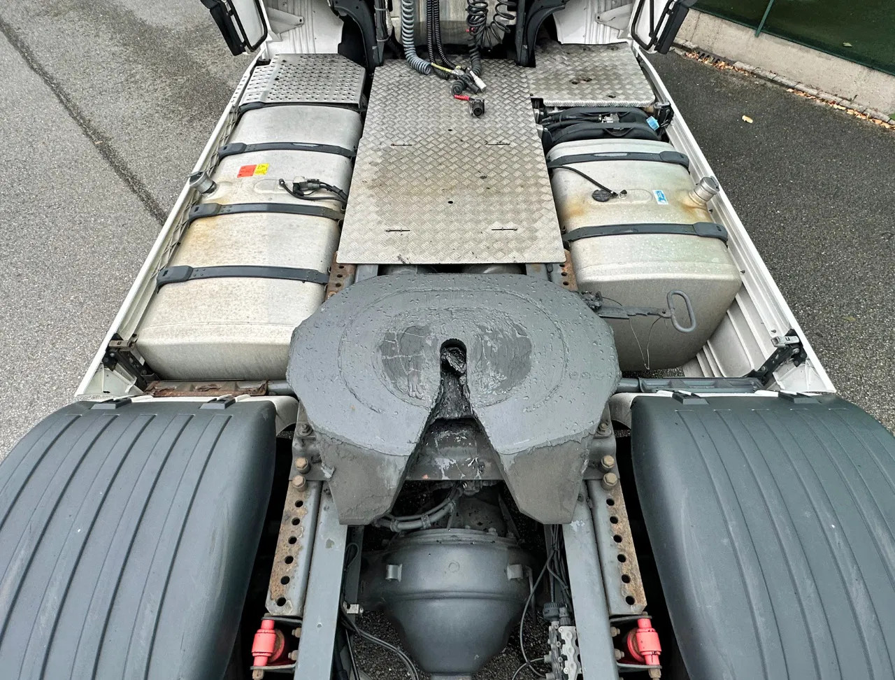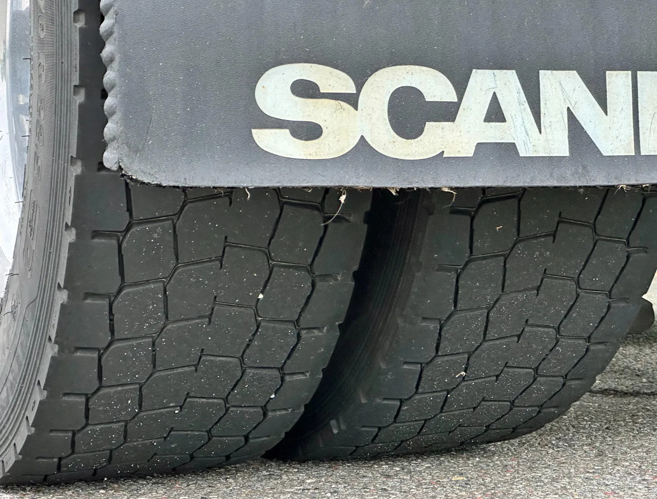 Eje trasero: Tamaño del neumático: 315/70 R22.5; Ruedas dobles; Llantas de aleación; Dibujo del neumático izquierda interior: 30%; Dibujo del neumático izquierda exterior: 30%; Dibujo del neumático derecha exterior: 30%; Dibujo del neumático derecha exterior: 30%; Reducción: reducción sencilla