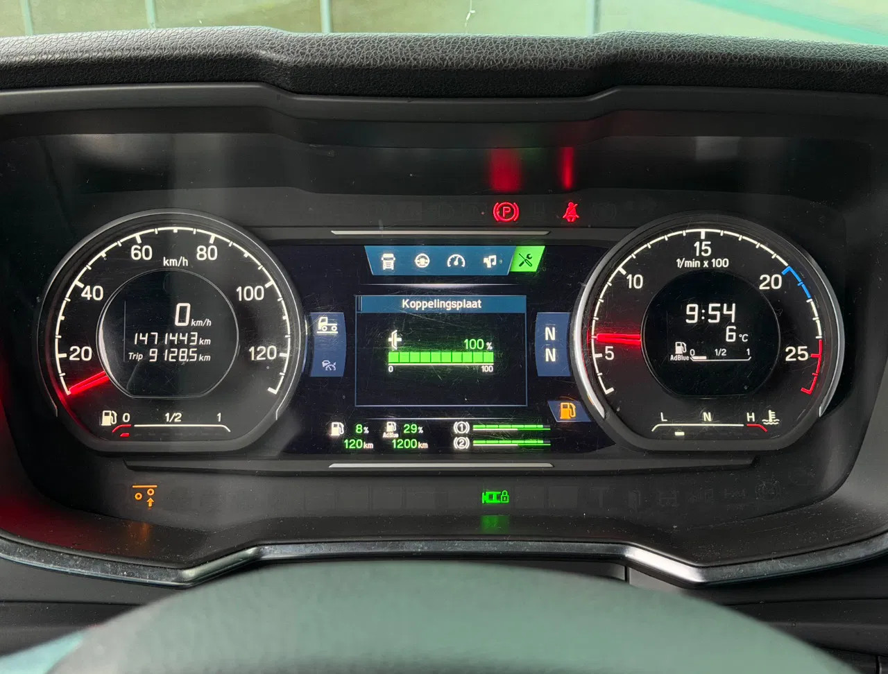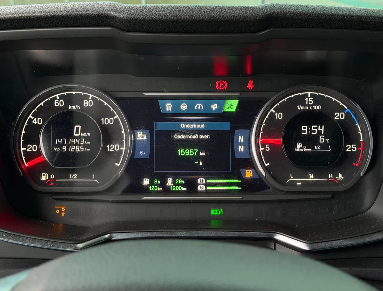Eje trasero 1: Tamaño del neumático: 315/80 R22.5; Ruedas dobles; Llantas de aleación; Carga máxima del eje: 11500 kg; Dibujo del neumático izquierda interior: 30%; Dibujo del neumático izquierda exterior: 30%; Dibujo del neumático derecha exterior: 30%; Dibujo del neumático derecha exterior: 30%; Reducción: reducción sencilla