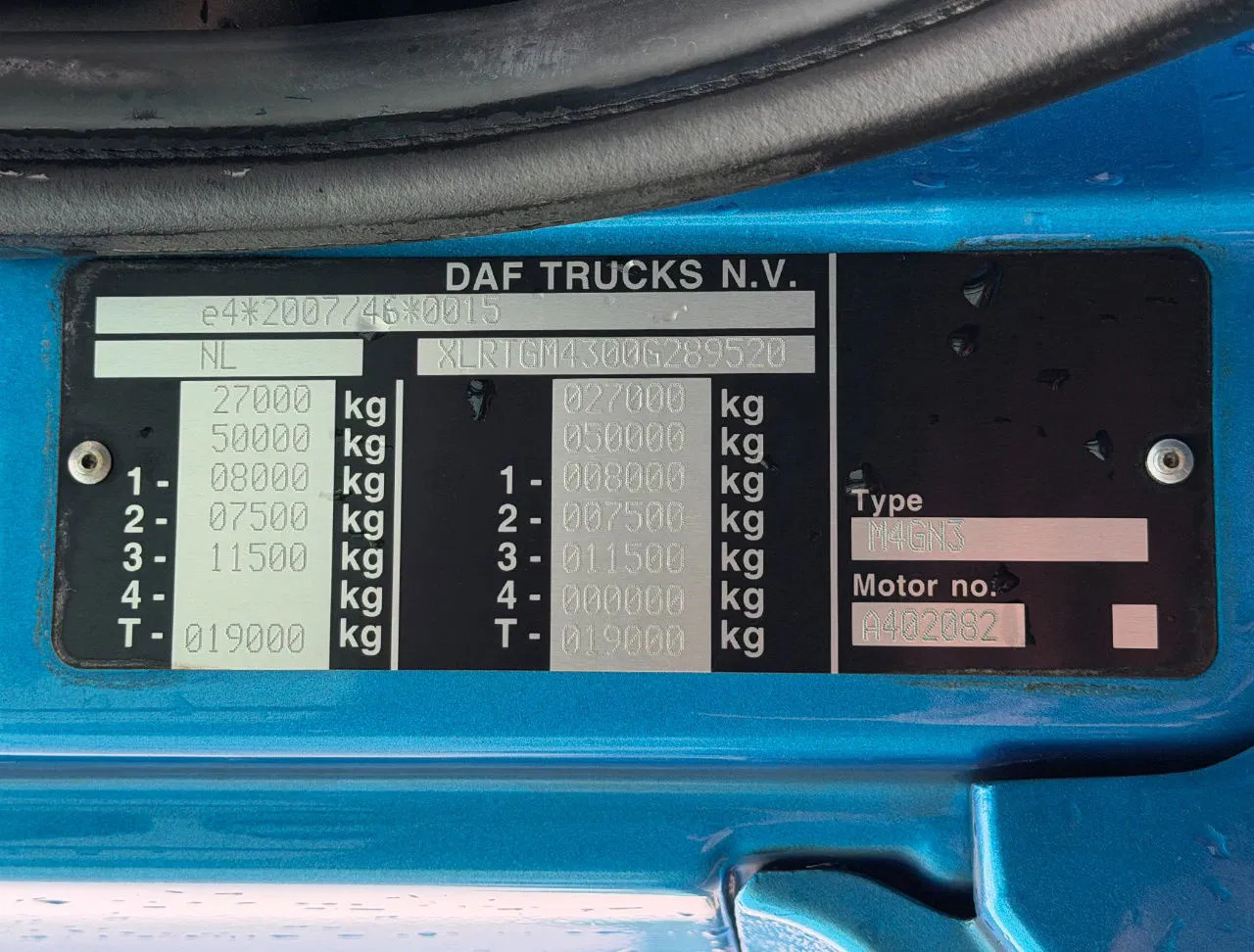 Extra’s: Manual gearbox (ZF 16 Gears), ZF Intarder (Retarder), Climate Control with airconditioning, Parking heater, Refrigeration, Cruise Control, 525 (Original DAF), CLANG connection, NATO-connection, Spoiler, Fenders, Optically and technically in very good condition, Mileage is 100% Original, Truck comes directly from first owner (Owner/Driver), Complete service history available