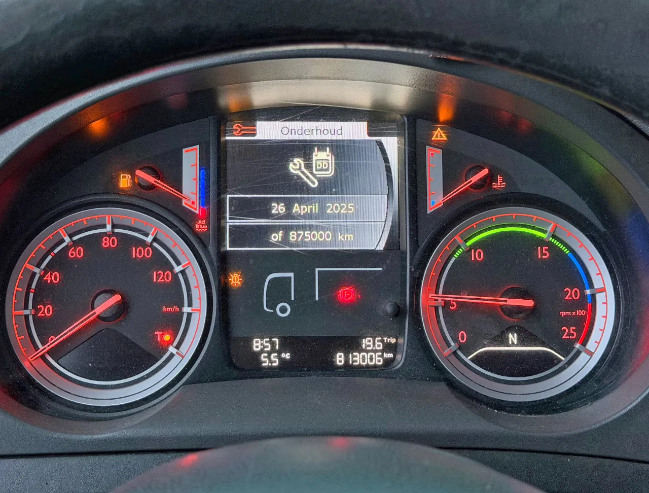 Achteras: Bandenmaat: 315/60 22.5; Dubbellucht; Max. aslast: 11500 kg; Bandenprofiel linksbinnen: 20%; Bandenprofiel linksbuiten: 20%; Bandenprofiel rechtsbinnen: 20%; Bandenprofiel rechtsbuiten: 20%