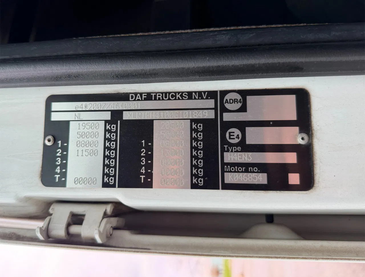Achteras: Bandenmaat: 315/70 R22.5; Dubbellucht; Max. aslast: 11500 kg; Bandenprofiel linksbinnen: 20%; Bandenprofiel linksbuiten: 20%; Bandenprofiel rechtsbinnen: 20%; Bandenprofiel rechtsbuiten: 20%; Reductie: enkelvoudige reductie