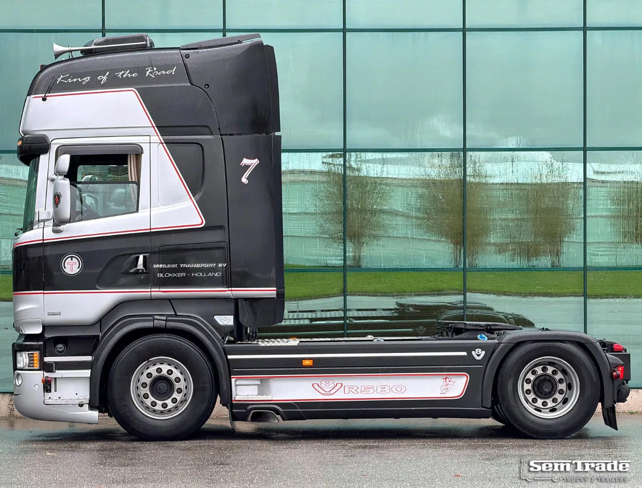 Extra’s: King of the Road package, Retarder, Airsuspended front axle, Complete upholstered cabin done by Special Interior (Top class, still in perfect condition), Double Windows, Navigation system, Climate Control with airconditioning, Parking Airconditioning, Parking heater, Refrigeration, 2x luxury leather seats, Cruise Control, Xenon headlights, 1.200 liter aluminium tank (Original Scania), CLANG connection, Many extra lights, Spoiler, Fenders, Side-skirts, Full service at Scania, All repairs done by Scania, Many parts are replaced recently, Truck comes straight from the first owner, Truck has had only 2 drivers in its whole career, If we say this truck has driven 500.000 km you would still believe it, Optically and technically in very good condition, Directly available and ready for work.